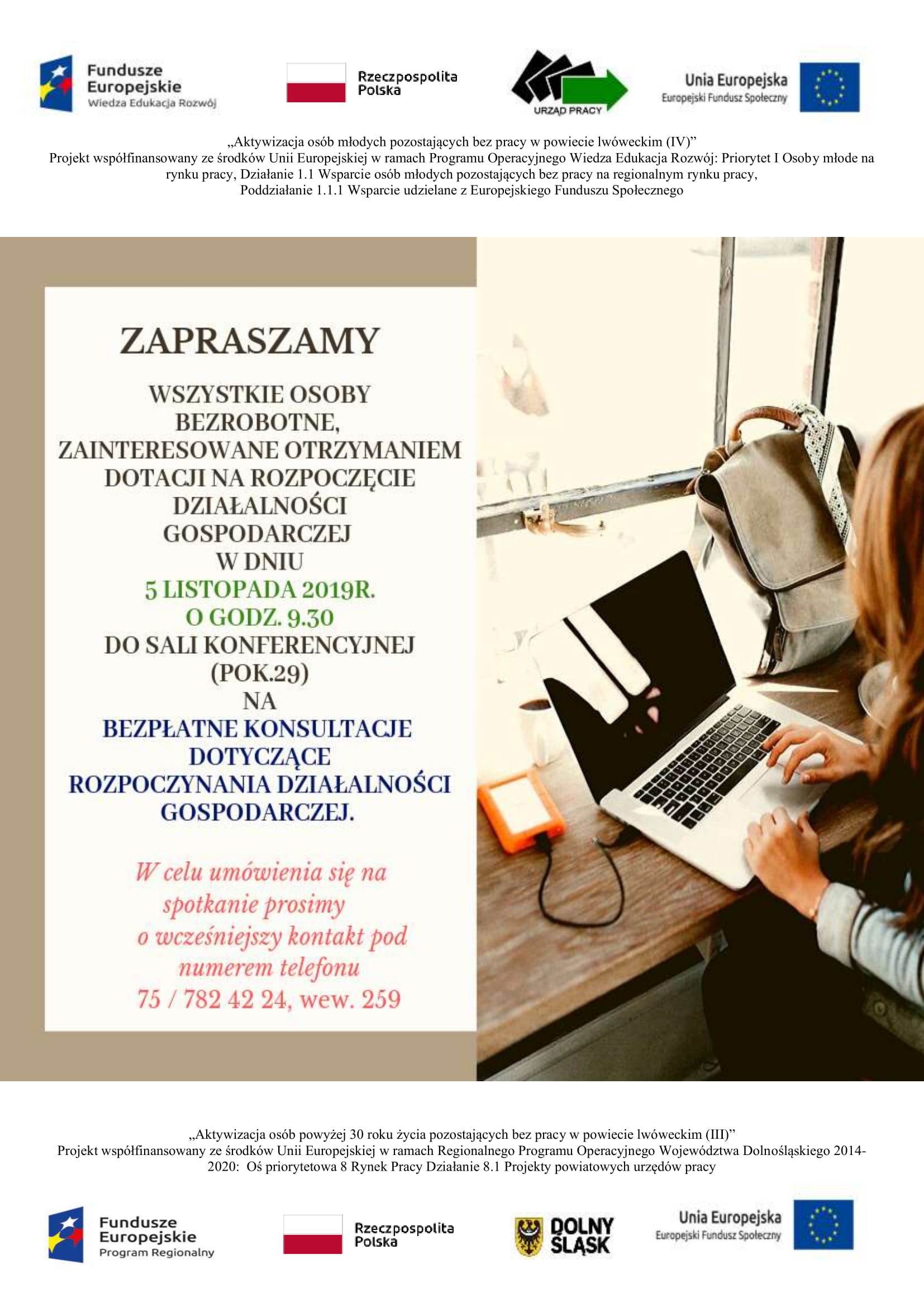 ARCHIWALNY - Zaproszenie na bezpłatne konsultacje dotyczące rozpoczynania działalności gospodarczej - 5 listopad 2019r. - Powiatowy Urząd Pracy w Lwówku Śląskim