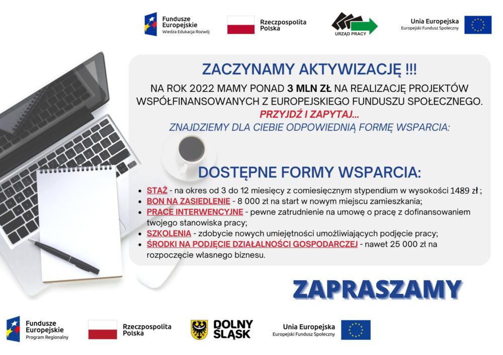 Powiatowy Urząd Pracy w Lwówku Śląskim zaprasza wszystkie osoby bezrobotne do skorzystania z dostępnych w urzędzie form wparcia współfinansowanych z Unii Europejskiej. Na rok 2022 mamy ponad 3 mln zł na realizację projektów współfinansowanych z Europejskiego Funduszu Społecznego.