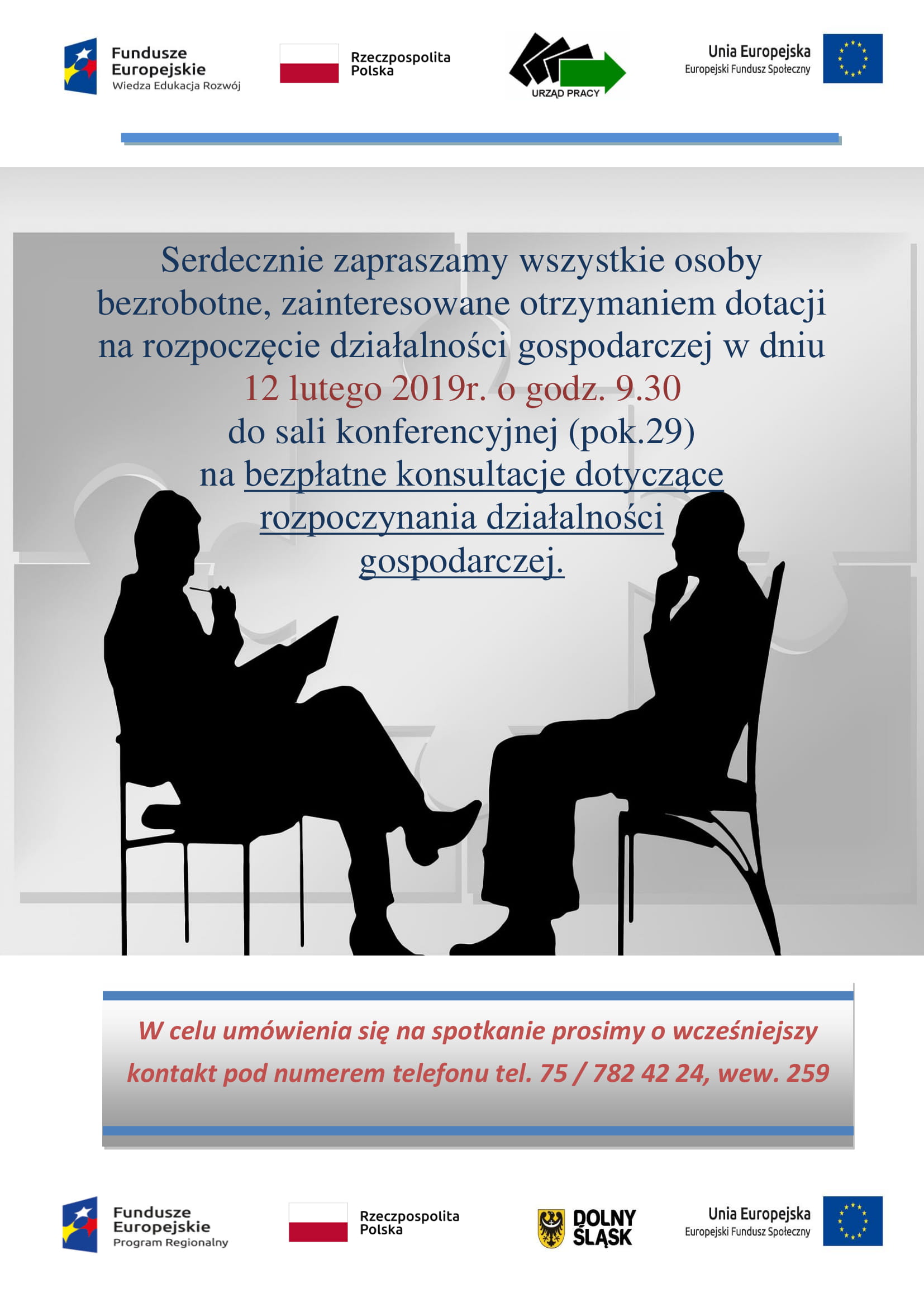 Powiatowy Urząd Pracy w Lwówku Śląskim zaprasza wszystkie osoby bezrobotne, zainteresowane otrzymaniem dotacji na rozpoczęcie działalności gospodarczej w dniu 12 lutego 2019r. o godz. 9.30 do sali konferencyjnej (pok.29) na bezpłatne konsultacje dotyczące rozpoczynania działalności gospodarczej.