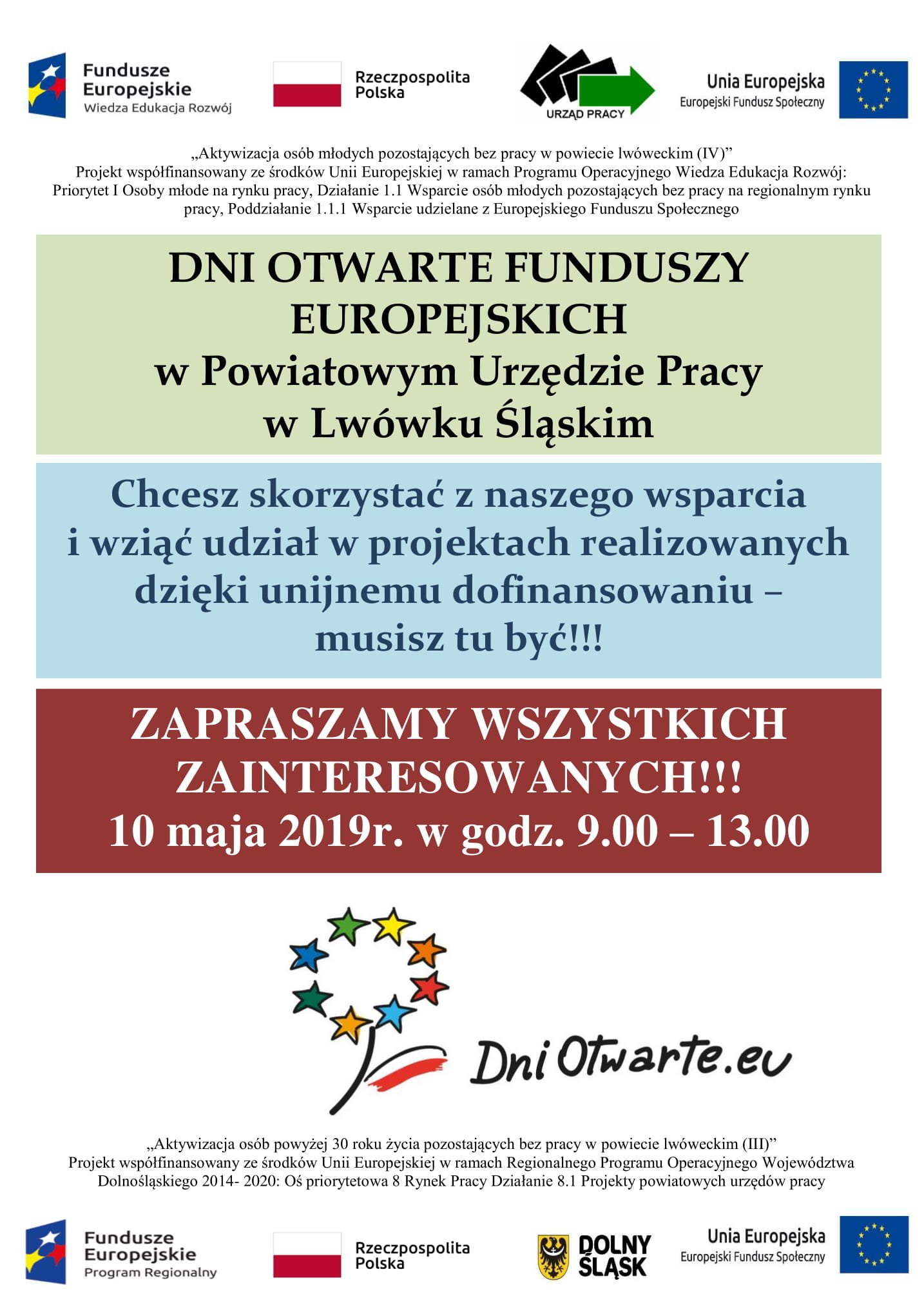 Powiatowy Urząd Pracy w Lwówku Śląskim zaprasza na Dni Otwarte Funduszy Europejskich, które odbędą się 10 maja 2019r. w godz. 9.00-13.00 w siedzibie Urzędu.