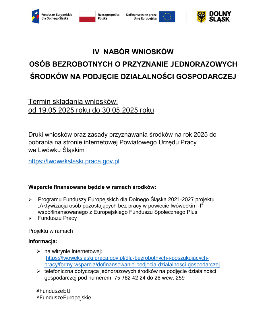 IV NABÓR WNIOSKÓW OSÓB BEZROBOTNYCH O PRZYZNANIE JEDNORAZOWYCH ŚRODKÓW NA PODJĘCIE DZIAŁALNOŚCI GOSPODARCZEJ