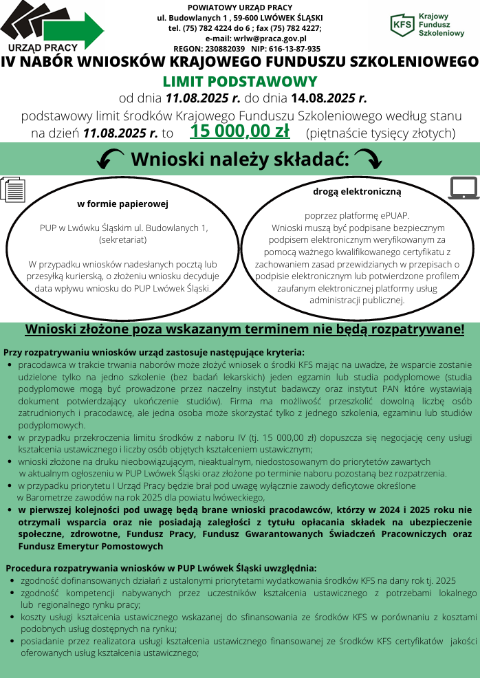 od dnia 11.08.2025 r. do dnia 14.08.2025 r. podstawowy limit środków Krajowego Funduszu Szkoleniowego według stanu na dzień 11.08.2025 r.