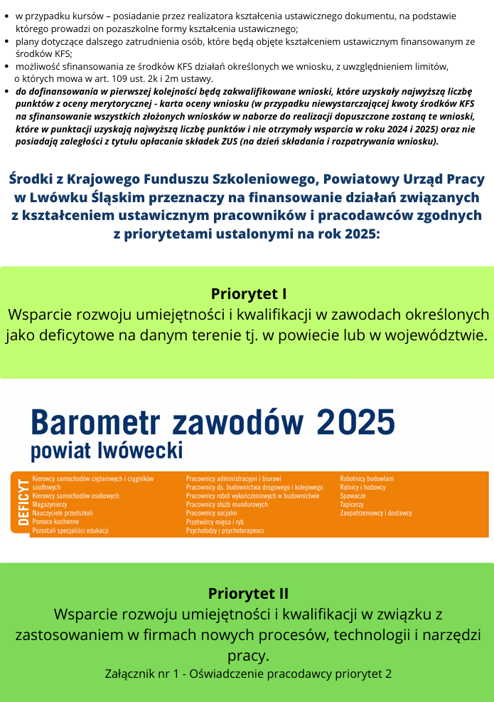 - w przypadku priorytetu I Urząd Pracy będzie brał pod uwagę wyłącznie zawody deficytowe określone w Barometrze zawodów na rok 2025 dla powiatu lwóweckiego,