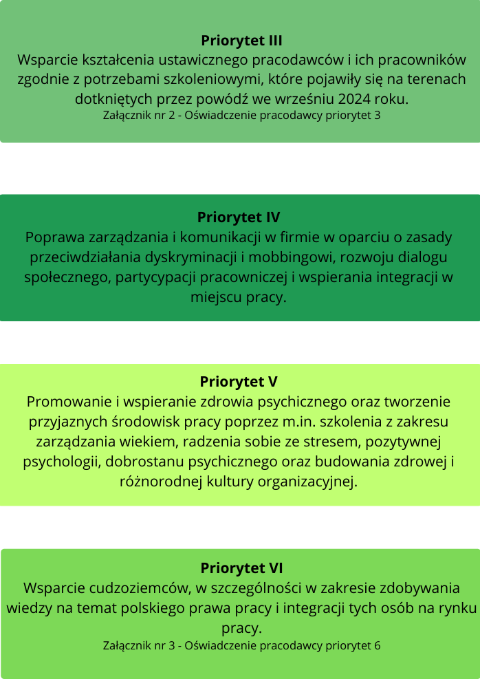 Priorytet III Wsparcie kształcenia ustawicznego pracodawców i ich pracowników zgodnie z potrzebami szkoleniowymi, które pojawiły się na terenach dotkniętych przez powódź we wrześniu 2024 roku. Załącznik nr 2 - Oświadczenie pracodawcy priorytet 3 |