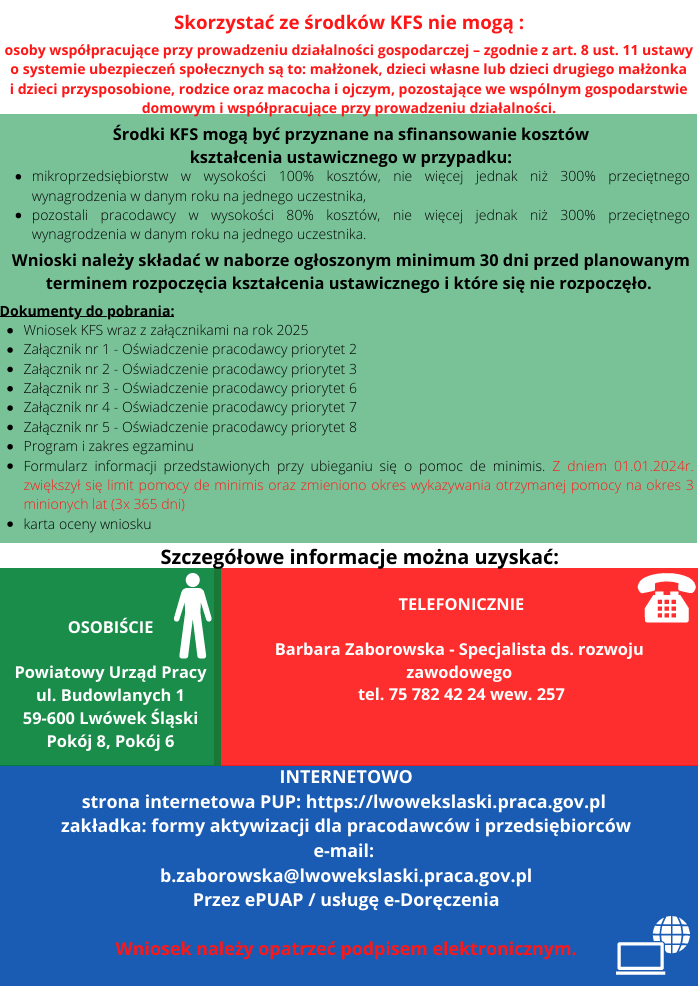 - pracodawca w trakcie trwania naborów może złożyć wniosek o środki KFS mając na uwadze, że wsparcie zostanie udzielone tylko na jedno szkolenie (bez badań lekarskich) jeden egzamin lub studia podyplomowe (studia podyplomowe mogą być prowadzone przez naczelny instytut badawczy oraz instytut PAN które wystawiają dokument potwierdzający ukończenie studiów). Firma ma możliwość przeszkolić dowolną liczbę osób zatrudnionych i pracodawcę, ale jedna osoba może skorzystać tylko z jednego szkolenia, egzaminu lub studiów podyplomowych.
