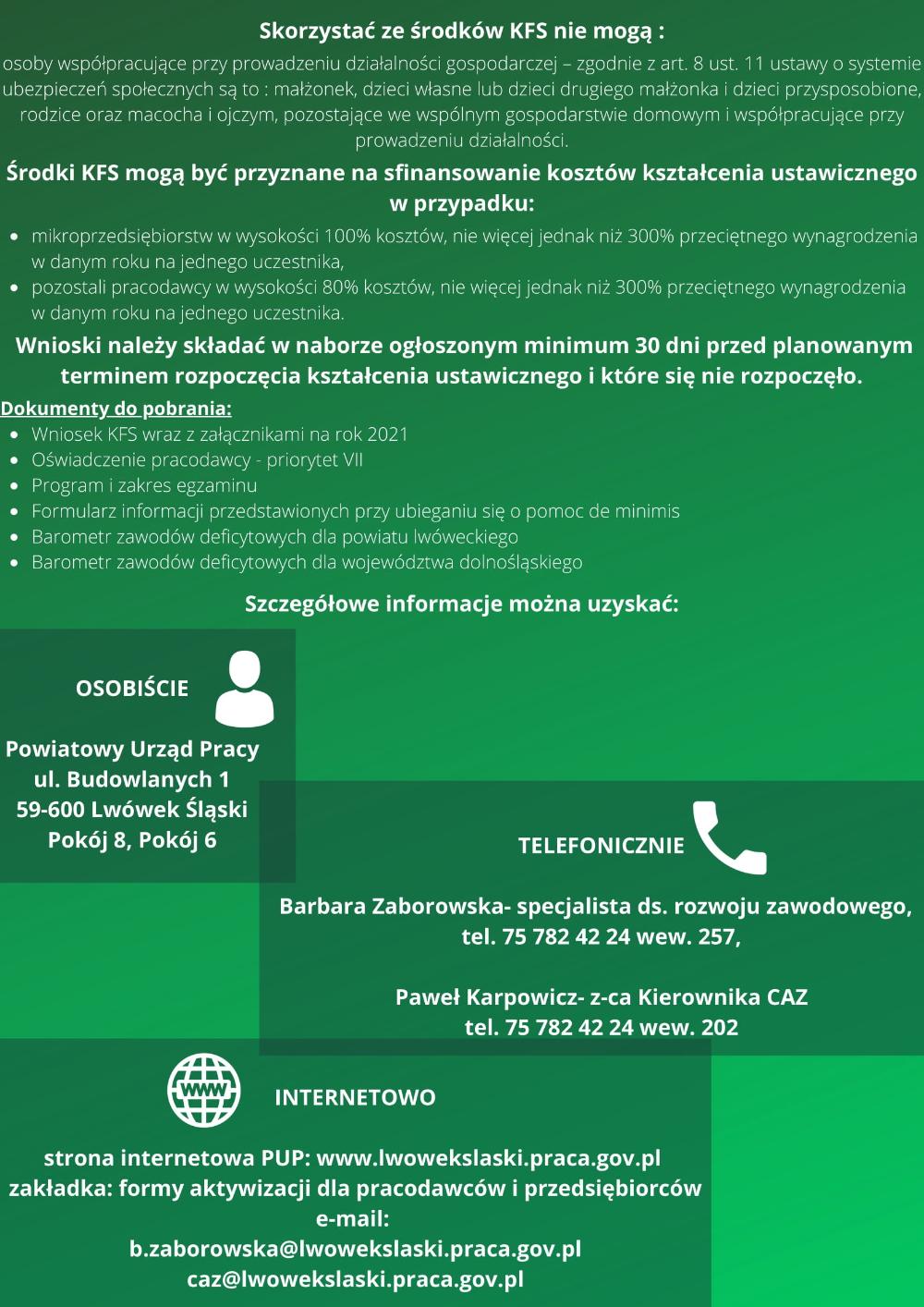Realizacja postanowień umowy podlega kontroli starosty/ powiatowego urzędu pracy. Na żądanie pracodawca obowiązany jest udzielić informacji na temat: liczby osób objętych działaniami finansowanymi z udziałem środków KFS według tematyki kształcenia ustawicznego, płci, grup wieku 15-24 lata, 25-34 lata, 35-44 lata, 45 lat i więcej oraz poziomu wykształcenia, liczby osób, które rozpoczęły kurs, studia podyplomowe lub przystąpiły do egzaminu – finansowane z udziałem środków KFS oraz liczby osób, które ukończyły z wynikiem pozytywnym kurs, studia podyplomowe lub zdały egzamin – finansowane z udziałem środków KFS.